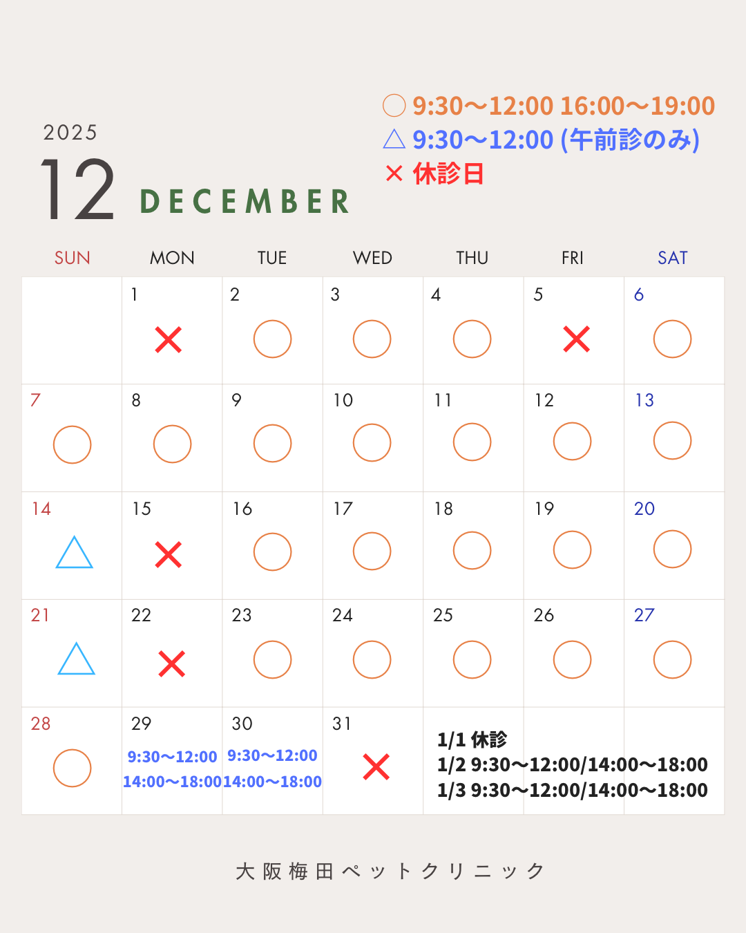 12/29~1/3は年末年始の特別診療時間となります。